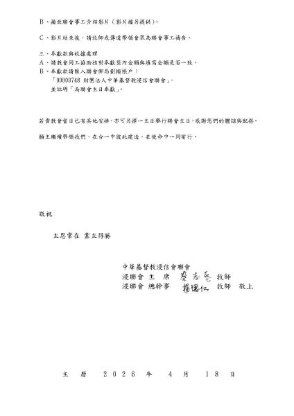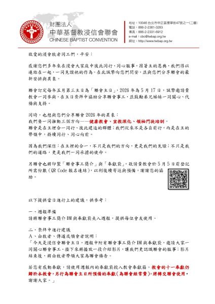 2026年我們將於 5月17日(五月第三主日)舉行聯會主日